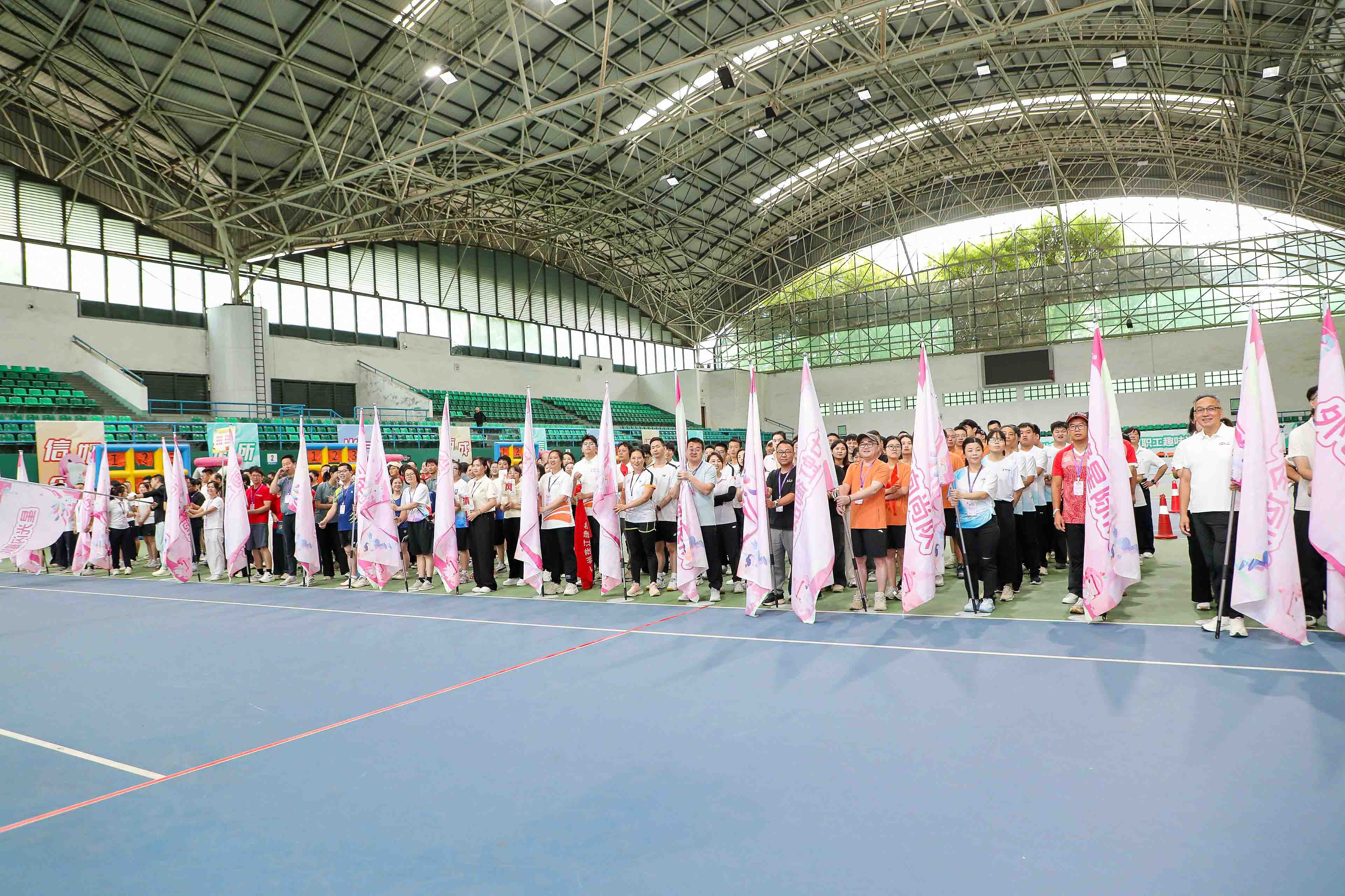 上午9时许,馆内彩旗飘扬,人声鼎沸,伴随着激昂的音乐,各方阵队伍身着统一队服依次入场,高举队牌,展现昂扬的精神团队风貌。